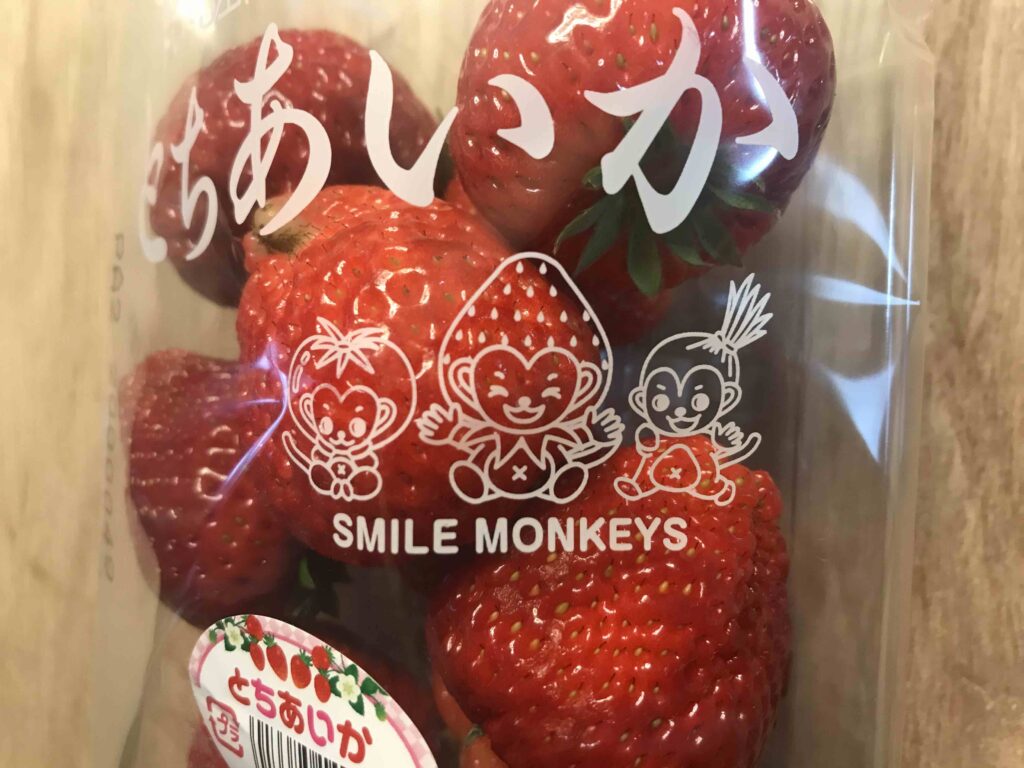 栃木県産の「とちあいか」にいたのは、JAかみつが・上都賀農業協同組合のキャラ「スマイルモンキーズ」。