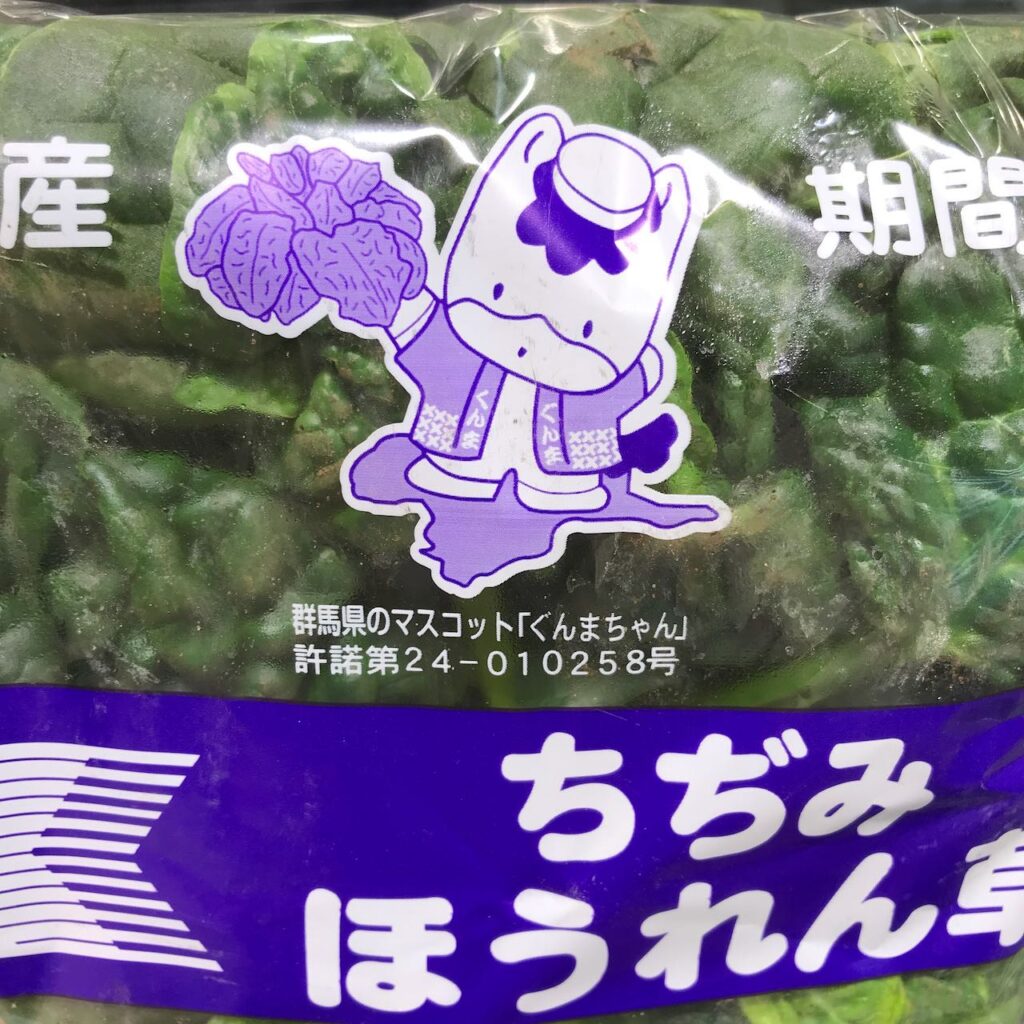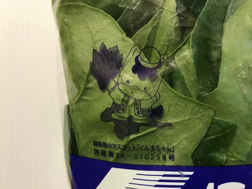 ぐんまちゃんは、さまざまな農産物のパッケージで、その農産物を持って農キャラとなっているのをよく見かけるのですが、なんと寒じめほうれん草にもいたのです。(もちろんほうれん草にもいます。)