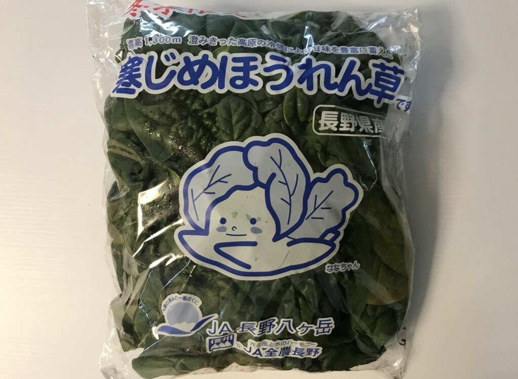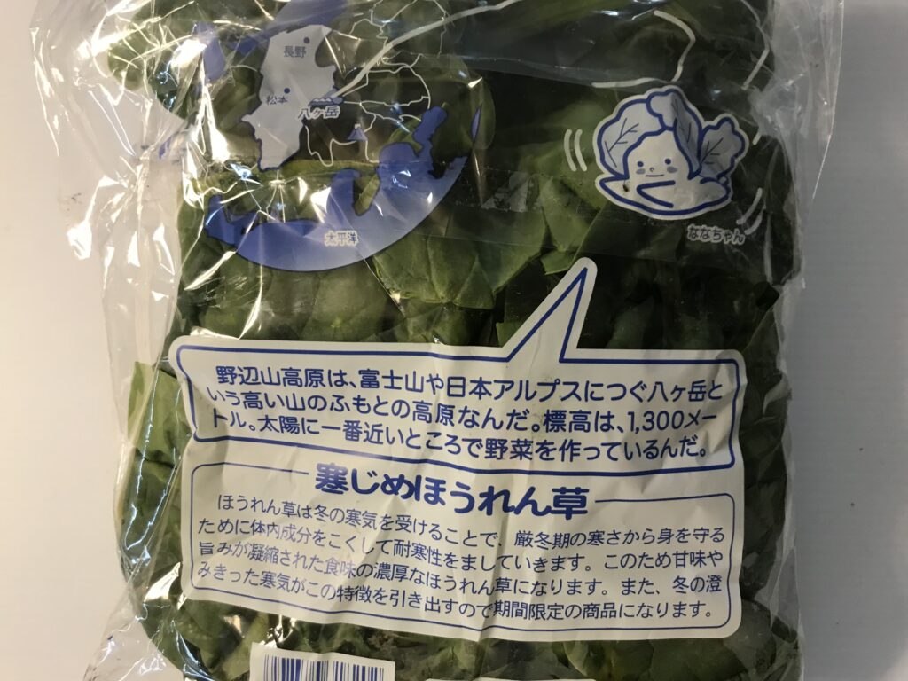 パッケージの裏面では、産地の野辺山高原についてと、寒じめほうれん草の説明をしてくれています。ななちゃん饒舌…!
