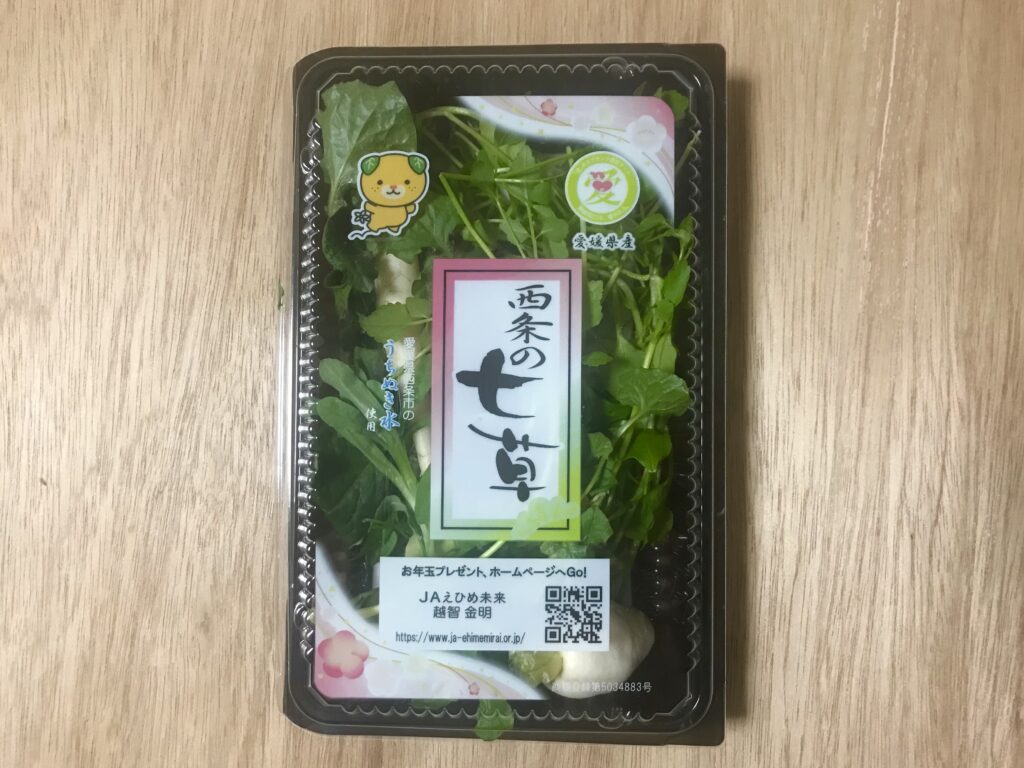 愛媛県産の七草には、ごきげんな「みきゃん」が!ちょっとだけとびはねているのがかわいいですね。